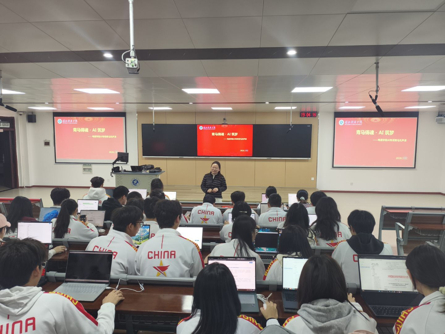 (通讯员:冯兴龙 摄影:张英姿 何丹莉)为深化青年马克思主义者培养工程内涵,推动青马精神培育与科技创新实践深度融合,助力2026年湖北科技学院“挑战杯”大学生创业计划竞赛备赛工作走深走实,2026年3月12日,湖北科技学院电子与信息工程学院“AI赋能砺匠心,青马学子展风采”AI专项青马先声课在温泉校区教三301正式举行。学院分团委书记、青马班班主任金伟老师担任主讲,青马班全体学员以饱满热情投入这场融思想性、技术性、实践性于一体的创新课堂,在AI赋能中锤炼备赛能力,在科技报国中践行青年担当。