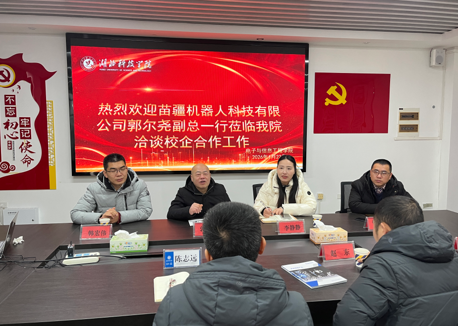 2026年1月22日下午,苗疆(武汉)机器人科技有限公司创始人兼CEO韩宏伟先生一行4人莅临我校电子与信息工程学院(以下简称“电信学院”),就推进校企深度合作、共育高素质技术技能人才进行专题洽谈。电信学院院长陈志远教授、骨干教师代表出席了洽谈会。